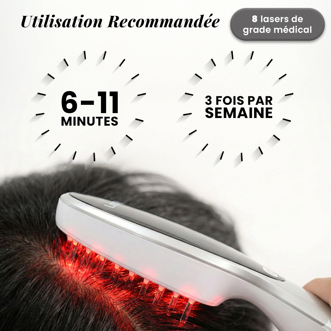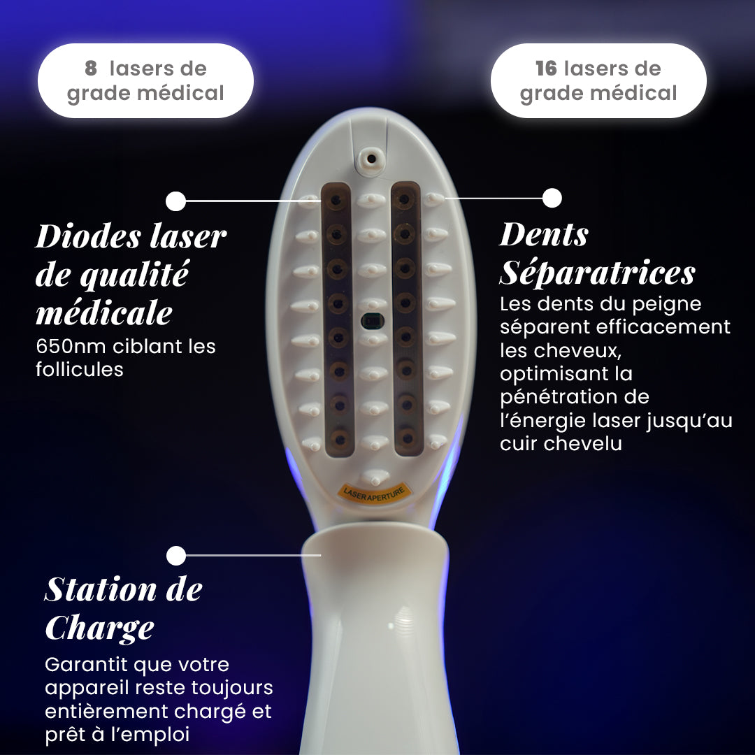 Le Laser Comb est un dispositif de repousse capillaire à usage domestique, cliniquement prouvé, conçu pour aider à prévenir la chute des cheveux et à favoriser la repousse naturelle chez les hommes et les femmes.