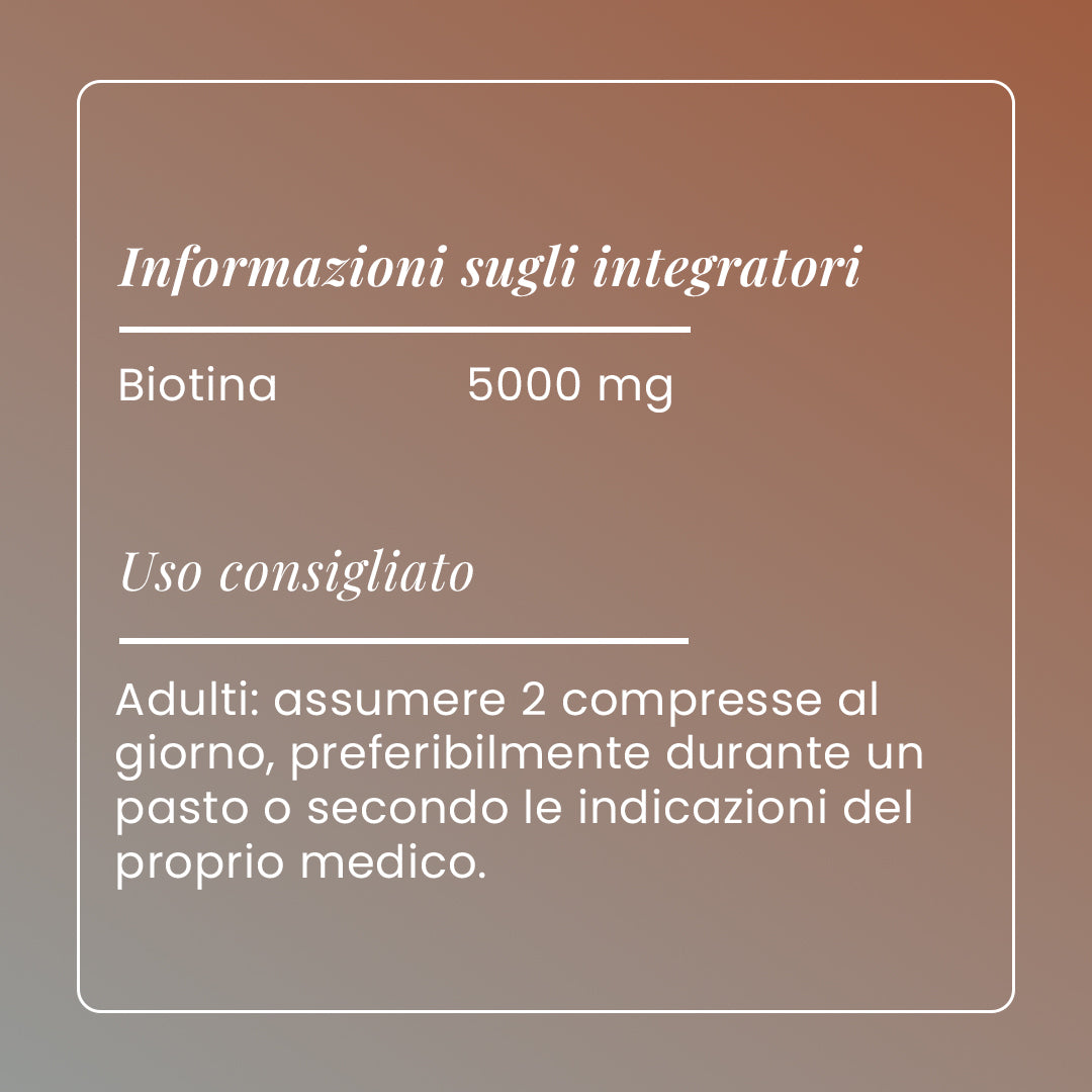 La Biotina (Vitamina B7) è una vitamina essenziale del complesso B, idrosolubile, che svolge un ruolo chiave nel mantenimento di capelli, pelle e unghie sani.