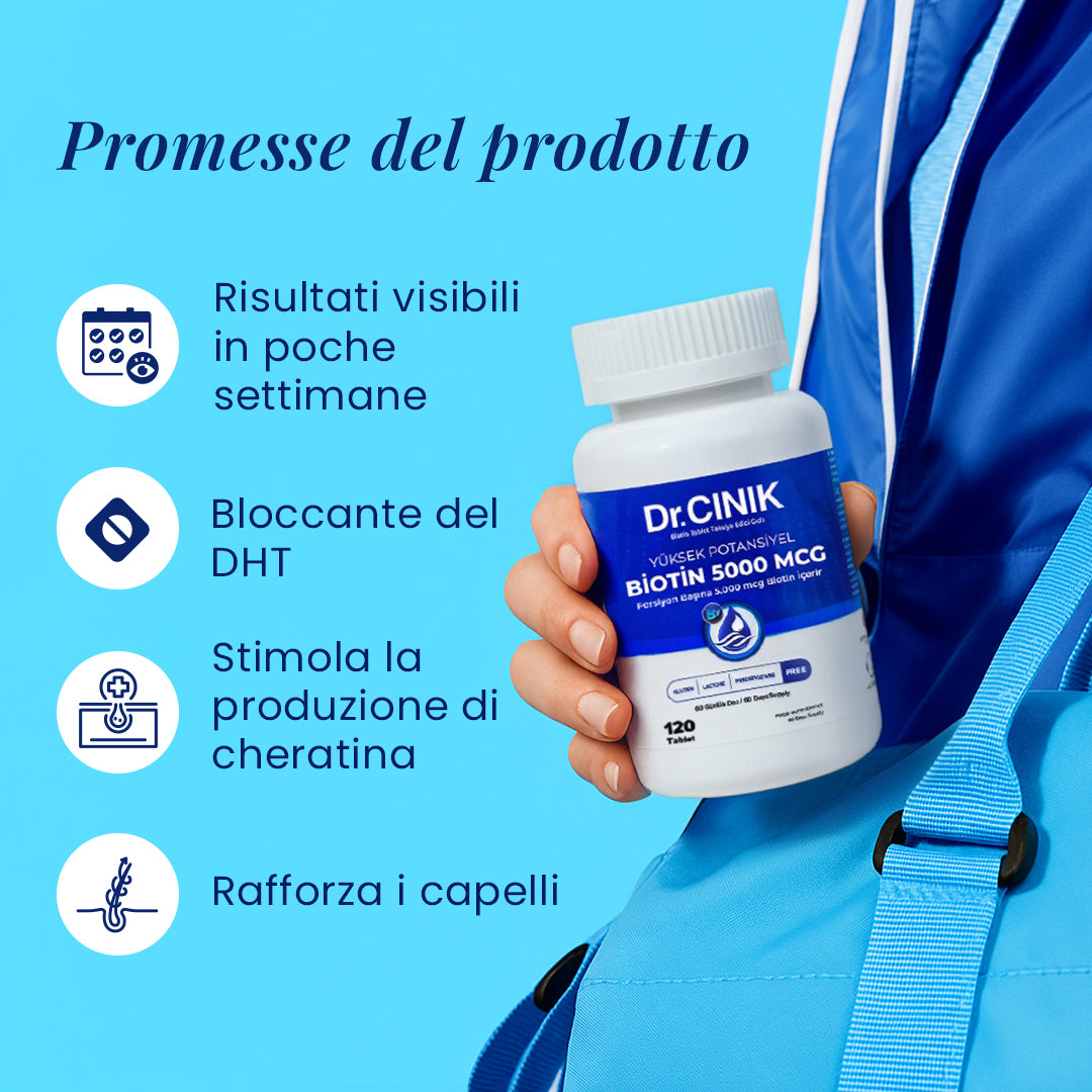 CINIK Plus Biotin fornisce una dose giornaliera ad alta potenza per supportare il corpo dall’interno verso l’esterno — favorendo capelli più forti, pelle luminosa e unghie più sane.