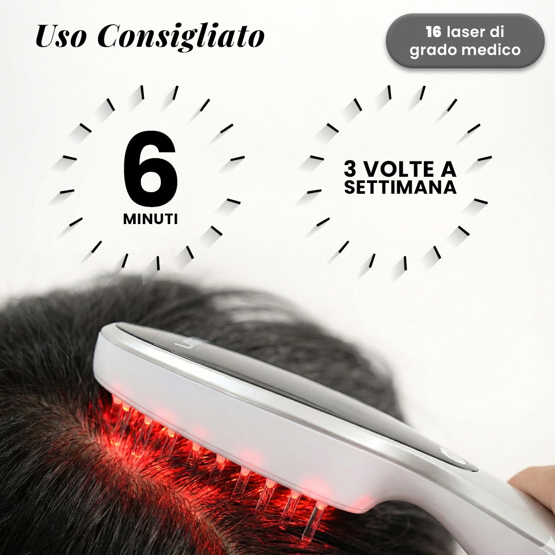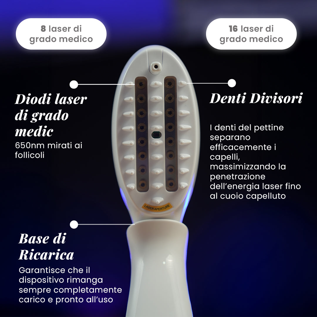 Laser Comb è un dispositivo per la ricrescita dei capelli clinicamente testato e progettato per l’uso domestico, ideato per aiutare a prevenire la caduta dei capelli e promuovere la ricrescita naturale sia negli uomini che nelle donne.
